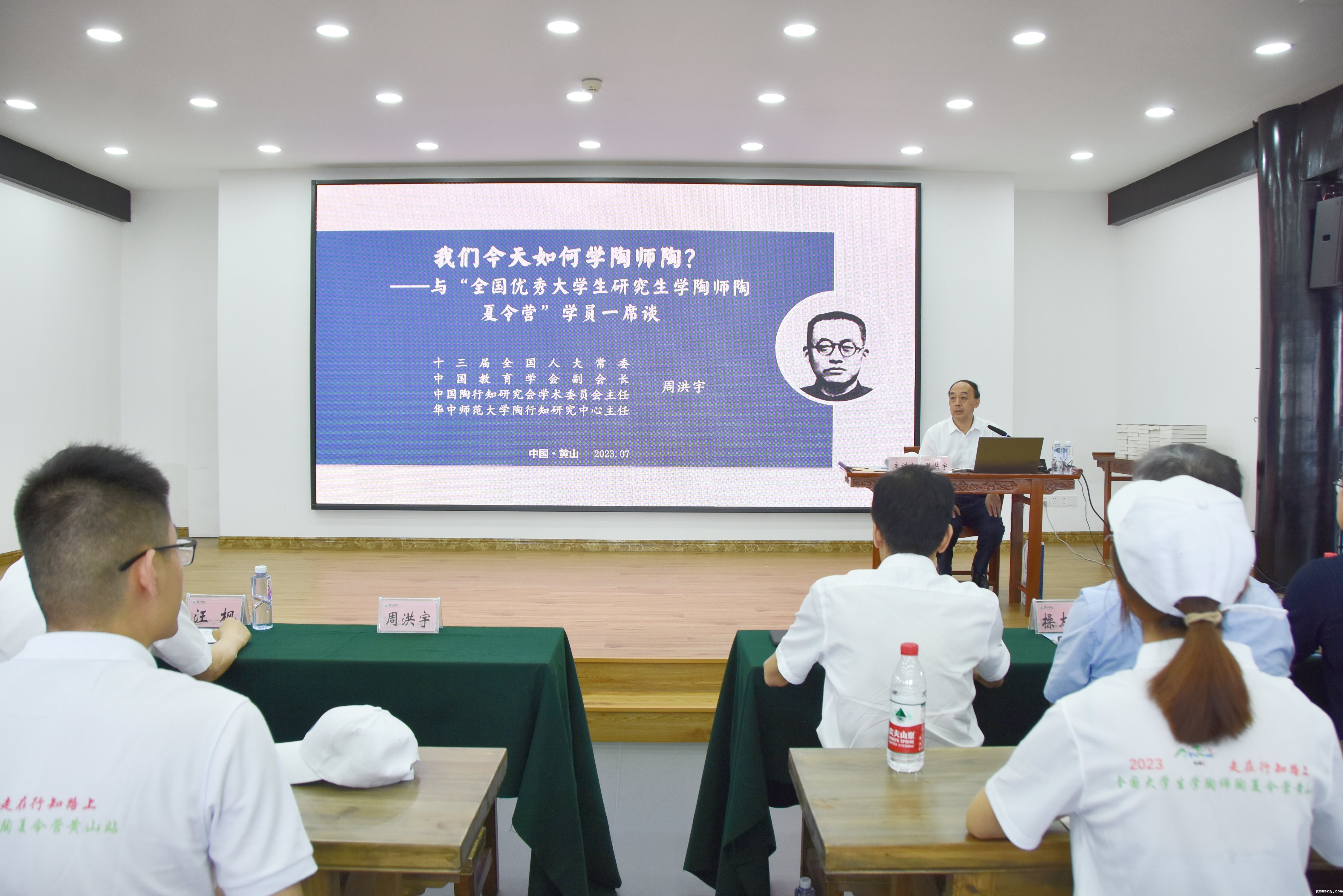 仪式结束后,周洪宇为学员们作了题为《我们今天如何学陶师陶》的学术报告,报告从了解毛泽东、江泽民、习近平等中央主要领导的相关论述入手来提高思想认识,了解国际学术界、教育界对陶行知的评价入手来开阔视野,研读原著、了解基本思想来打好基本功,融会贯通、联系实际来求得实效,从继承转化、创新发展入手来赋予其更加旺盛的时代生命力五个方面和大家分享了如何学陶师陶。