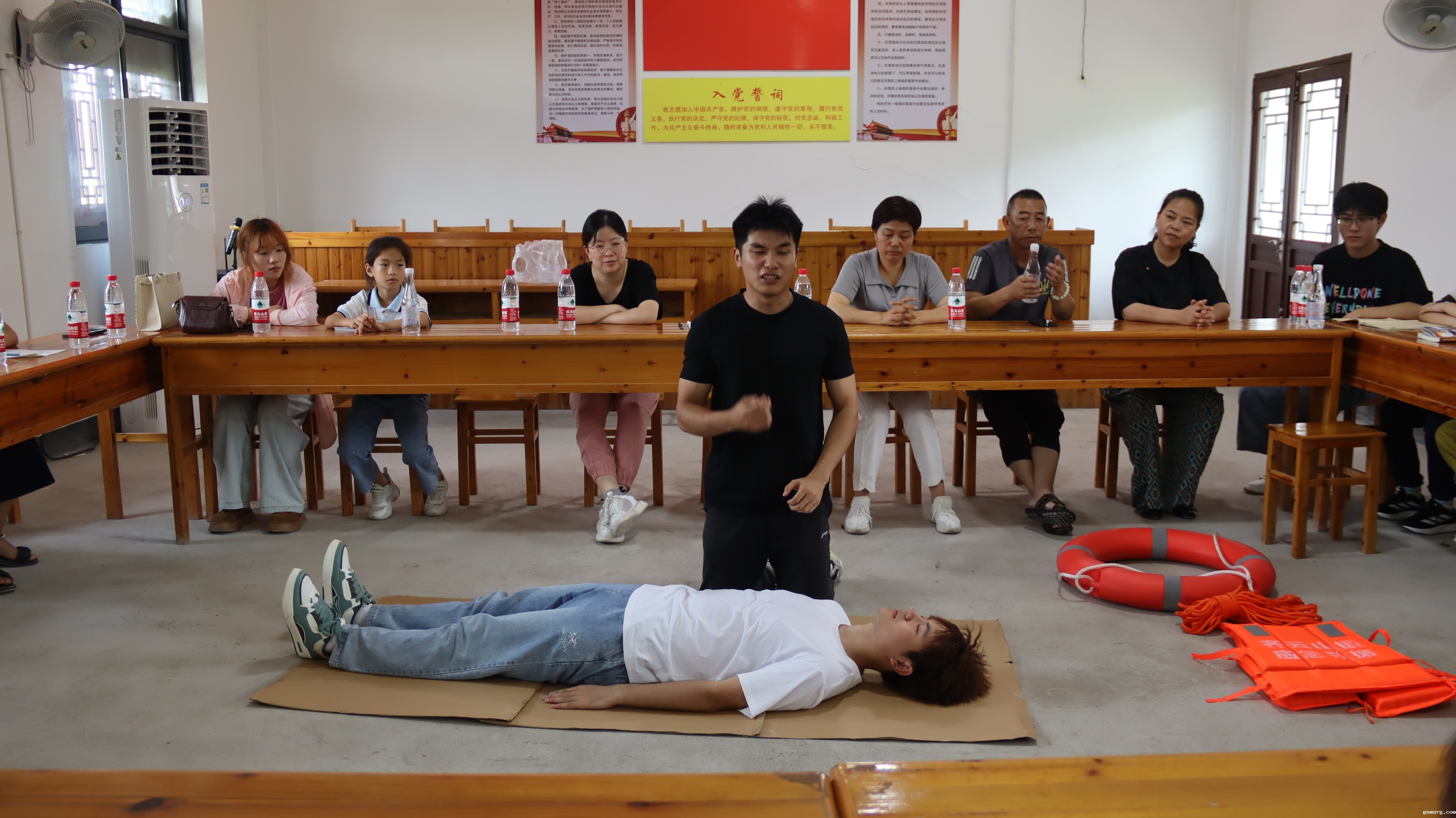“救出溺水者后,应迅速清除其口鼻中的污泥、杂草等,以保持呼吸通畅”,第九期“行知课堂”齐云山组学员、体育学院社会体育指导与管理专业学生王西雨从专业角度为齐云山镇留守儿童讲授了一堂生动的防溺水急救知识课。