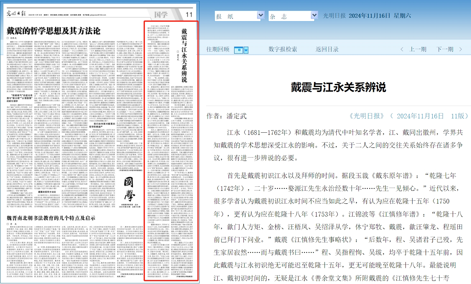 11月16日,我校文学院教授潘定武在《光明日报》国学版发表学术文章《戴震与江永关系辨说》。这是潘定武教授于戴震诞辰三百周年前后在《光明日报》发表的第二篇论文。