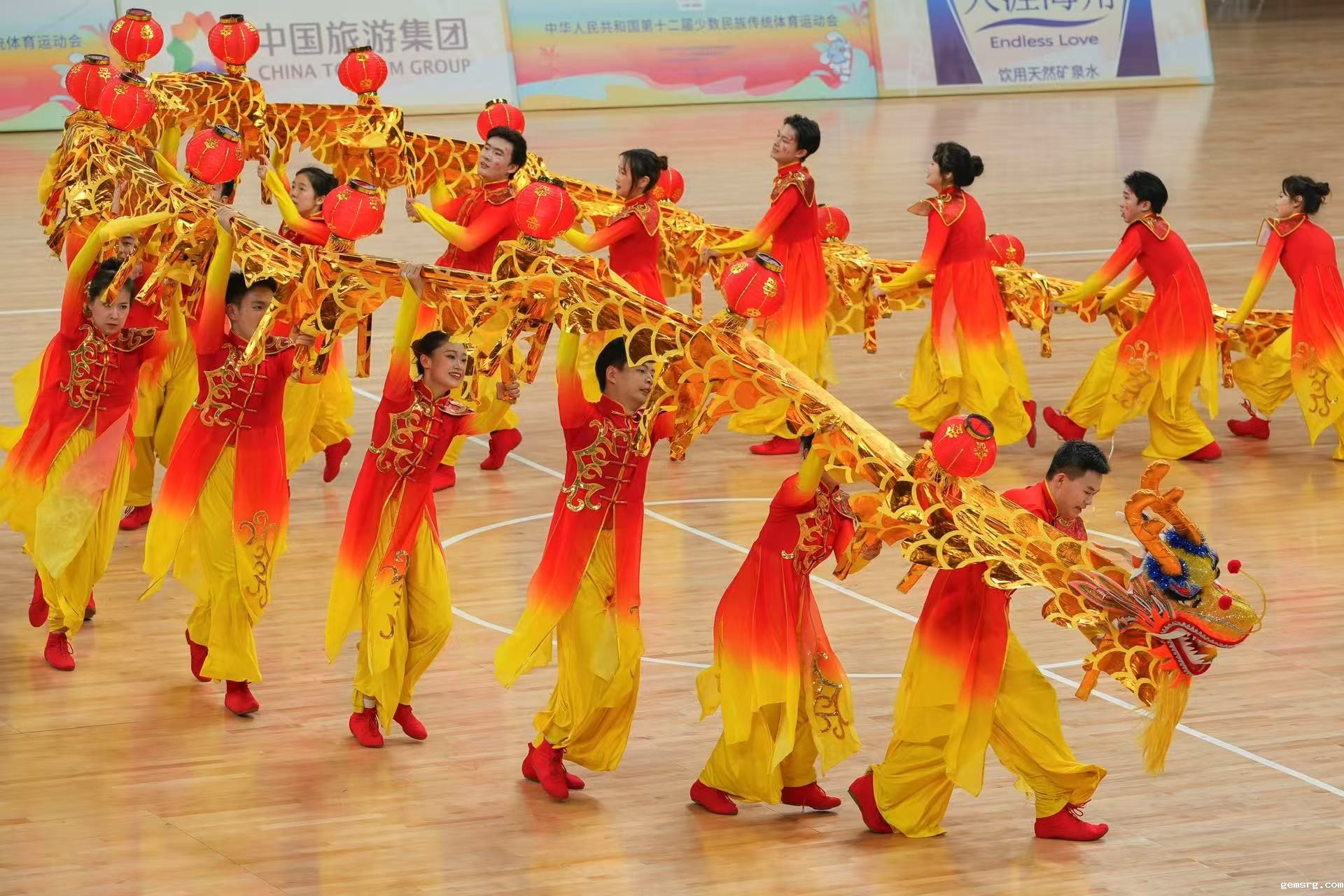 11月25日,运动会进入第三个比赛日,三亚体育中心迎来了一场视觉与文化盛宴,由伟德国际公司介绍20位各族学生组成的板凳龙表演登场,并获得第十二届全国少数民族传统体育运动会表演项目三等奖。比赛中,队员们肩扛板凳,首尾相连,金光闪烁的“龙身”在舞动中熠熠生辉。板凳龙表演来源于黄山市休宁县国家非物质文化遗产板龙的原型,通过改编、吸收和融合多种安徽地域文化元素,使其更具安徽特色的表现形式呈现出来。在众多精彩的表演项目中,伟德国际公司介绍呈现的板凳龙不仅展示了其独特的民间艺术形式,也让观众深刻感受到了传统文化的魅力和地域文化的骄傲。