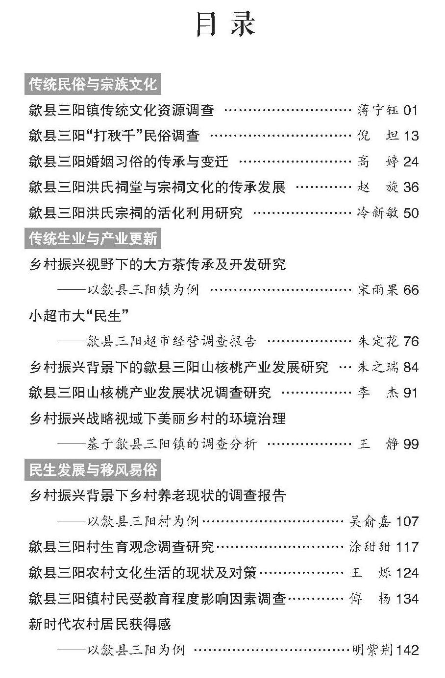 《徽州传统村落社会经济变迁调查报告选编》是非遗中心于2019、2021、2023年指导本校学生前往歙县三阳镇开展社会实践活动的成果汇编,共收录调查报告15篇,涉及传统民俗与宗族文化、传统生业与产业更新、民生发展与移风易俗等内容,全面呈现了三阳镇的宗祠古建等物质文化遗存,叠罗汉、打秋千等非物质文化遗存,山核桃、大方茶等特色产业,以及婚姻、生育、教育、养老等民生发展状况。马勇虎等教师对调研活动和撰写报告进行了具体而深入的指导。学生通过调研活动深入乡村、体验民情,锻炼了组织沟通、调研编撰能力。该成果汇编不乏优秀作品,通过学生的实地调研真实再现了三阳镇的发展变迁,展现了我校学生对乡村振兴的观察和思考。